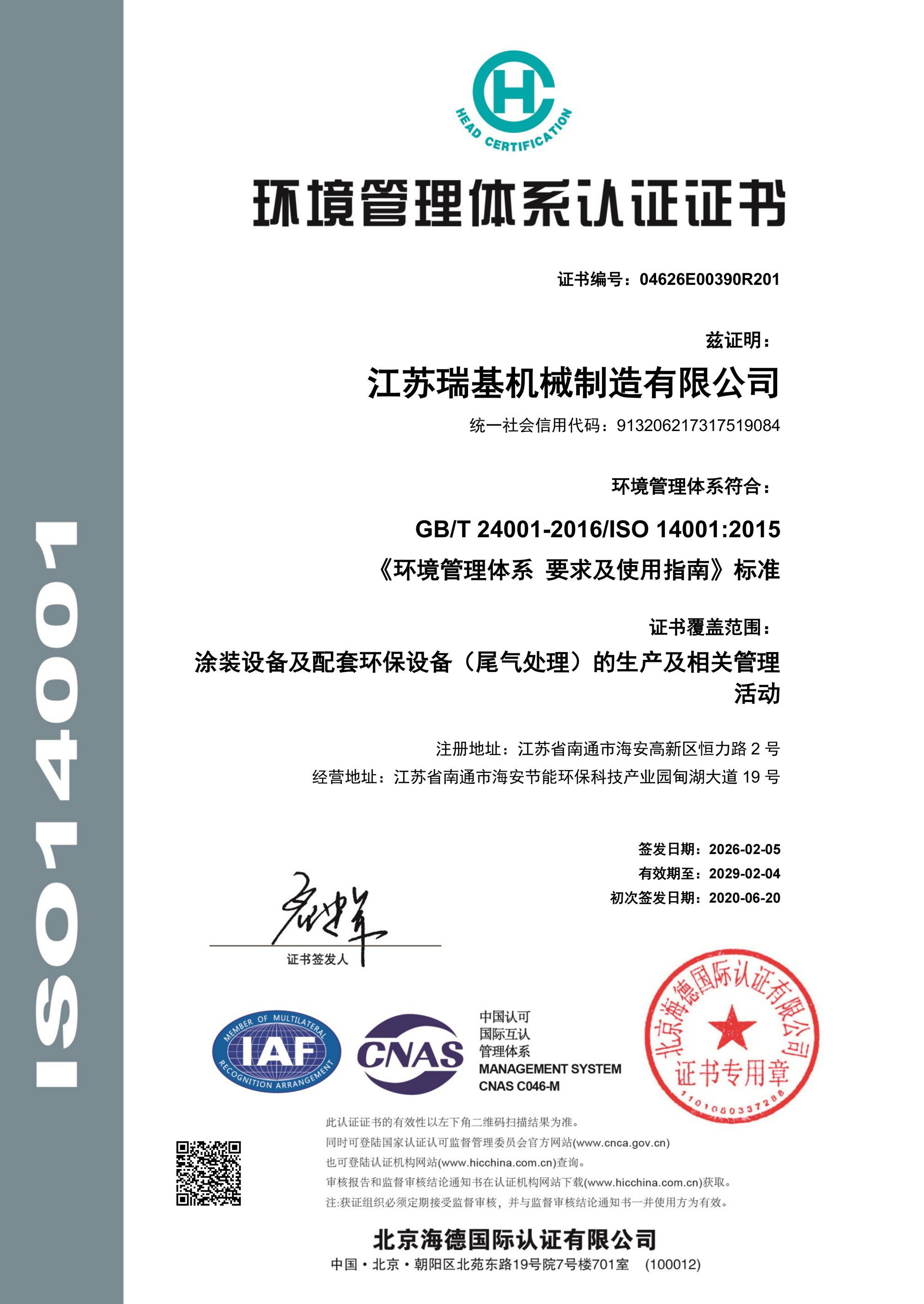 環境管理體系認證證書